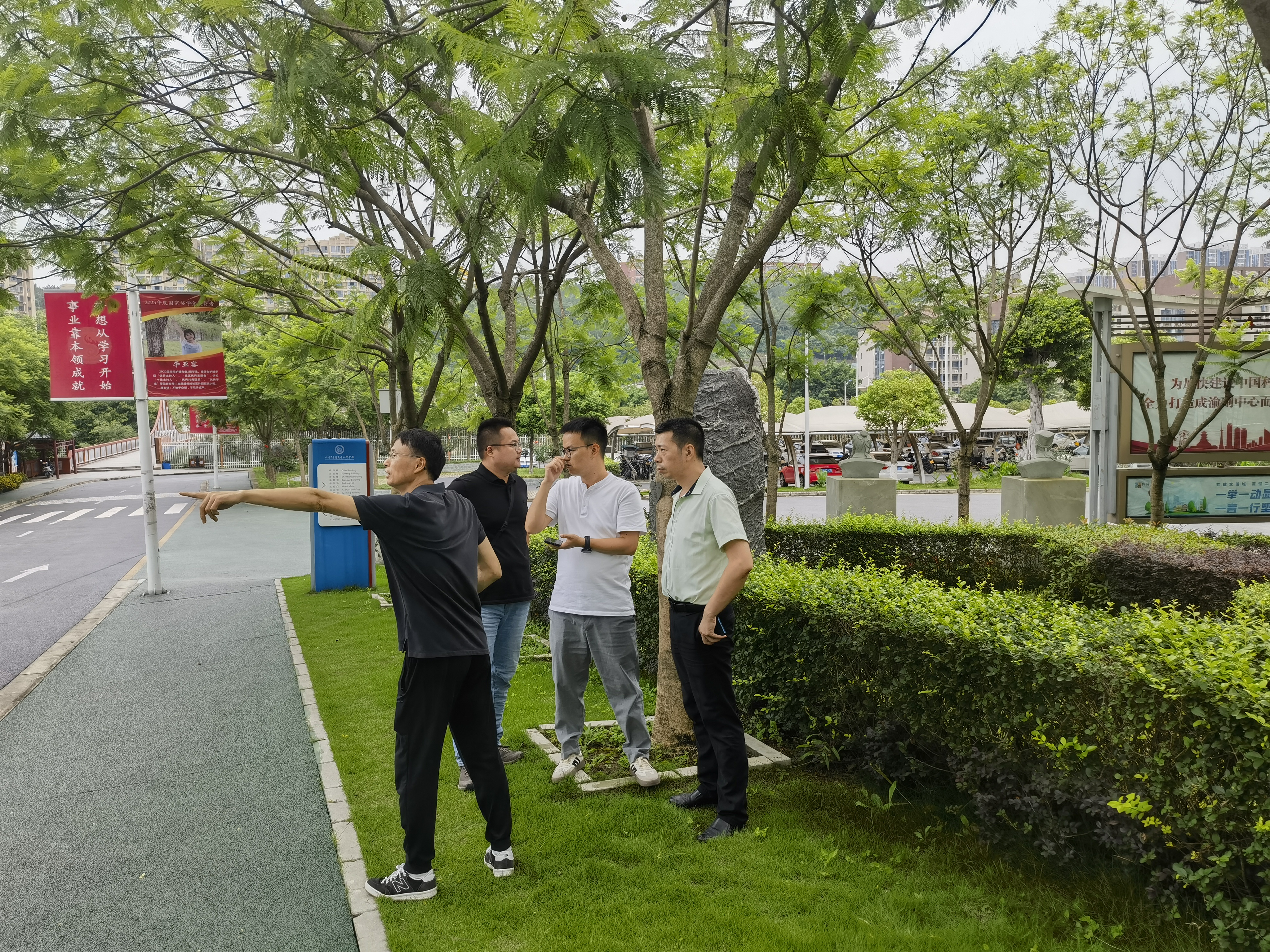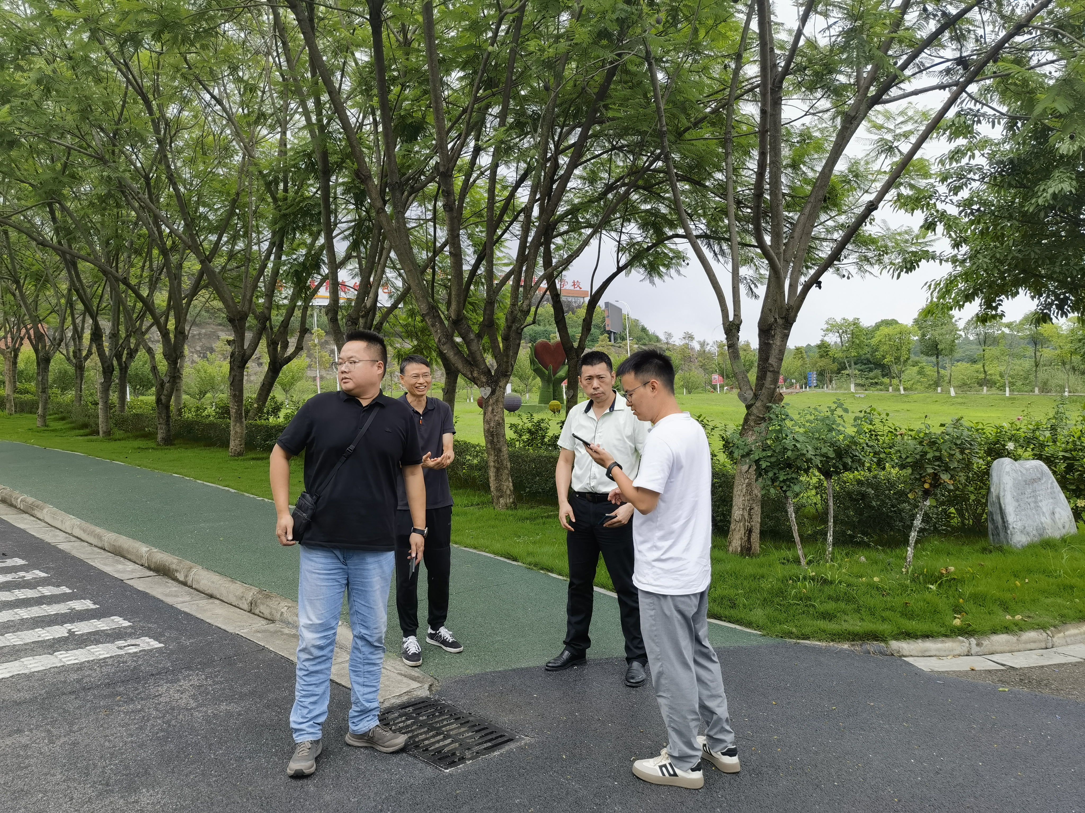 2024年7月15日下午,基建处彭皓处长带领基建处同志同中铁城际规划设计院的两位同志,到北校区现场查看室外有渗漏的消防管网的具体位置,绘制室外消防管网维修图纸和编制维修的工程量清单。
