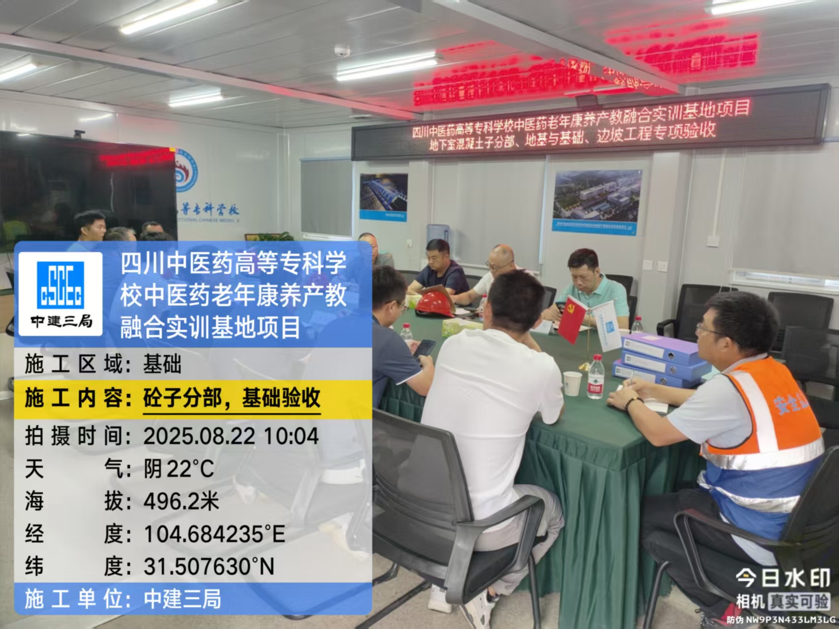 2025年8月22日上午9:30,绵阳市建设工程质量监督站徐可、毛肖宁、廖卫东一行到四川中医药高等专科学校中医药老年康养产教融合实训基地项目进行地下室混凝土子分部、地基与基础、边坡工程专项验收,建设单位四川中医药高等专科学校项目负责人彭浩、监理单位四川正菱建设监理咨询有限公司总监理工程师谢开、设计单位成都美厦建筑设计有限公司委派负责人顾涛、勘察单位中铁城际规划建设有限公司委派负责人陶平、施工单位中建三局集团有限公司项目负责人王坤斌等五方责任主体参加。