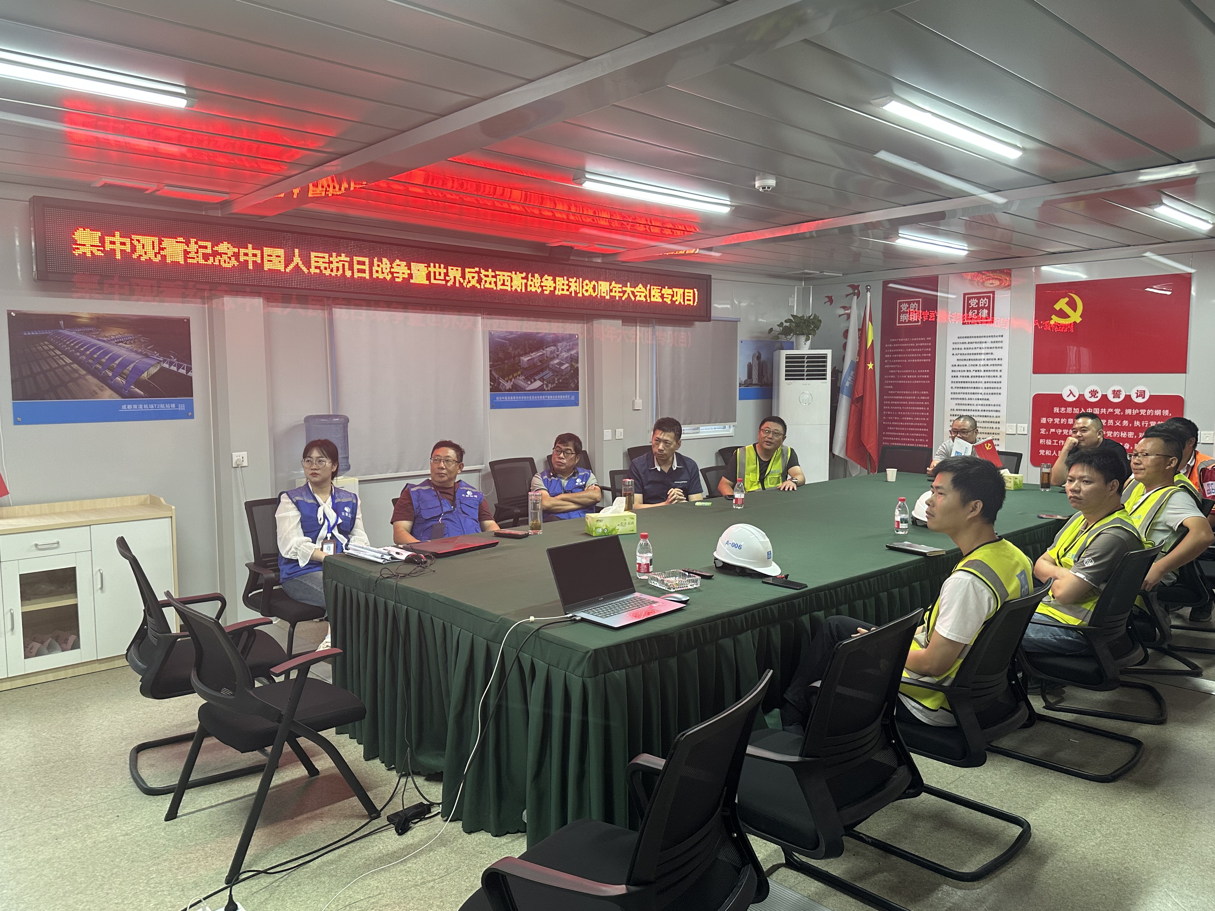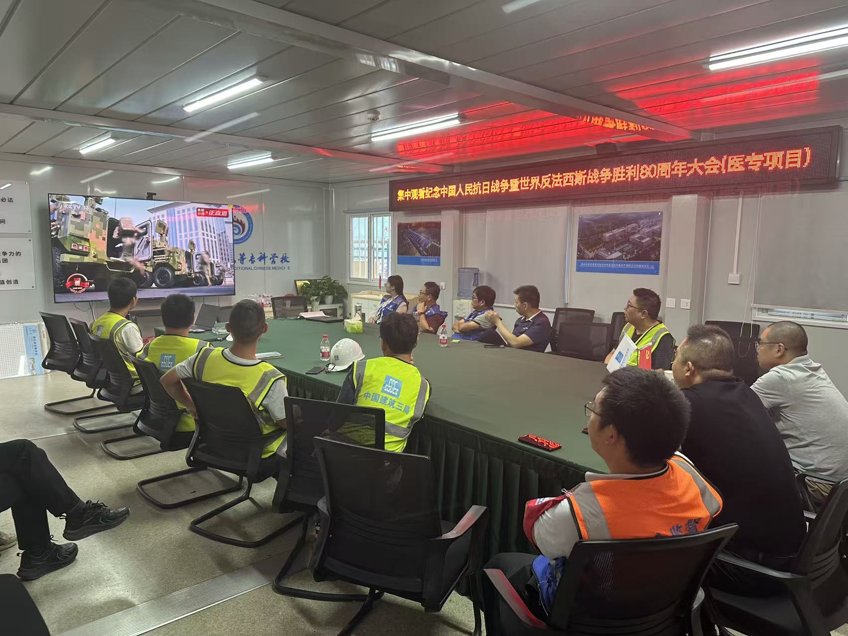 2025年9月3日上午,中医药老年康养产教融合实训基地项目办公室内,基建处处长彭浩主持校基建处全员与中医药老年康养产教融合实训基地项目的施工单位、监理单位相关人员,共同观看了在北京天安门广场举行的中国人民抗日战争暨世界反法西斯战争胜利80周年纪念大会和阅兵式直播。全体基建人员与工程建设者们齐聚屏幕前,共同见证历史时刻,感受强国强军的力量。