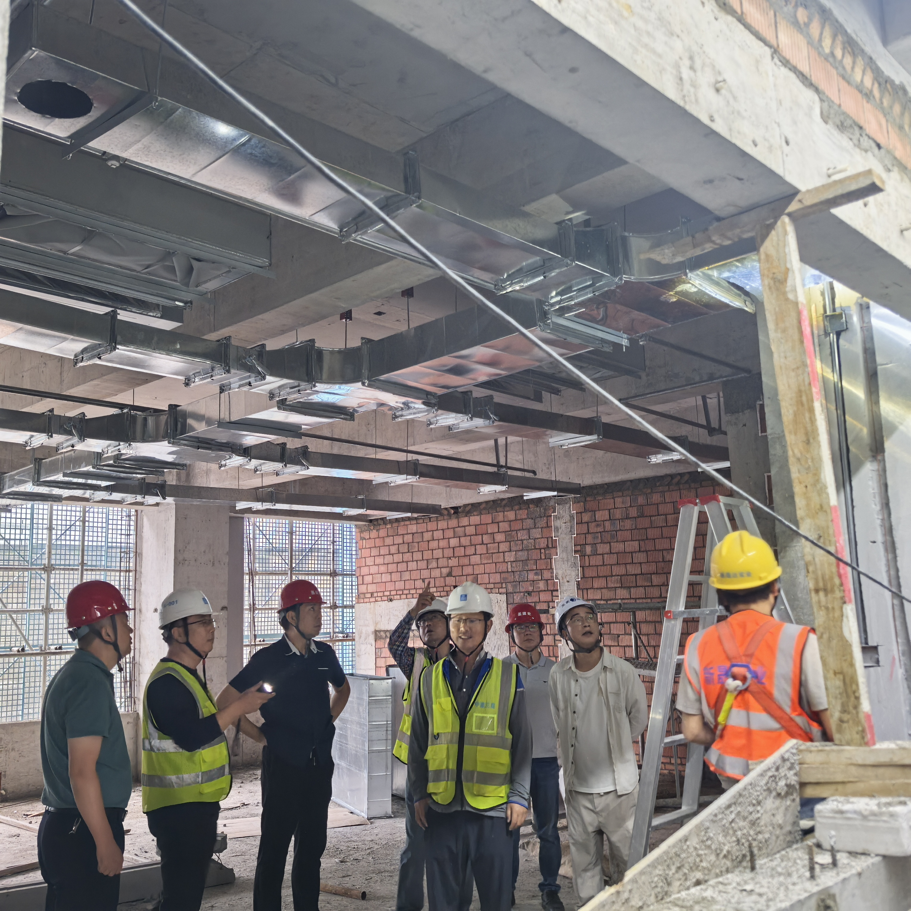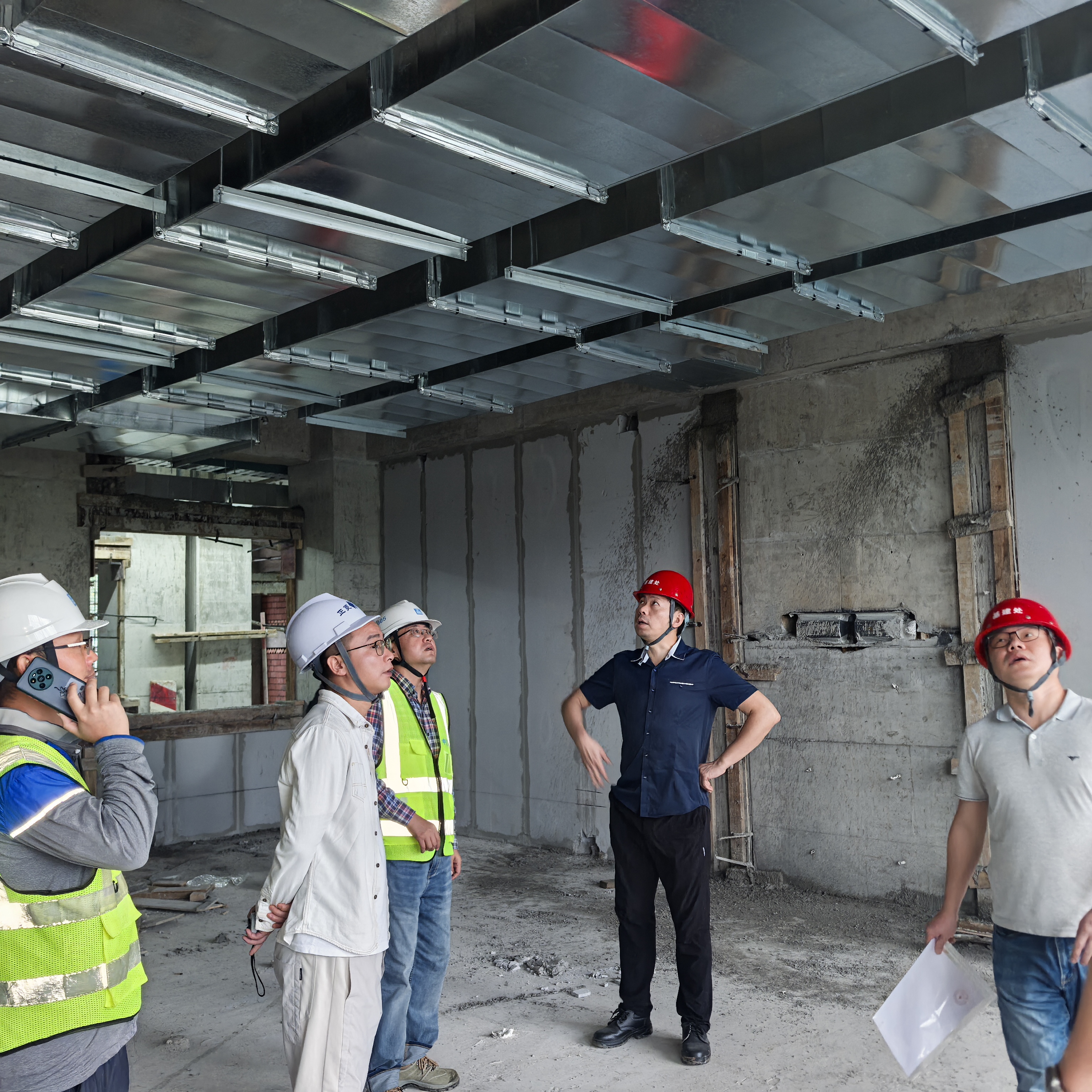 检查期间,彭浩处长一行实地察看了项目各楼层的施工情况。目前,康养项目正处于紧张的内部施工阶段,地下负一层正在进行墙面抹灰作业,一至五层已全面展开二次结构施工,现场秩序井然。处领导重点检查了地下室墙面的抹灰质量以及风管等机电设备的安装情况,并就施工工艺、材料规范等细节与现场技术人员进行了深入交流。