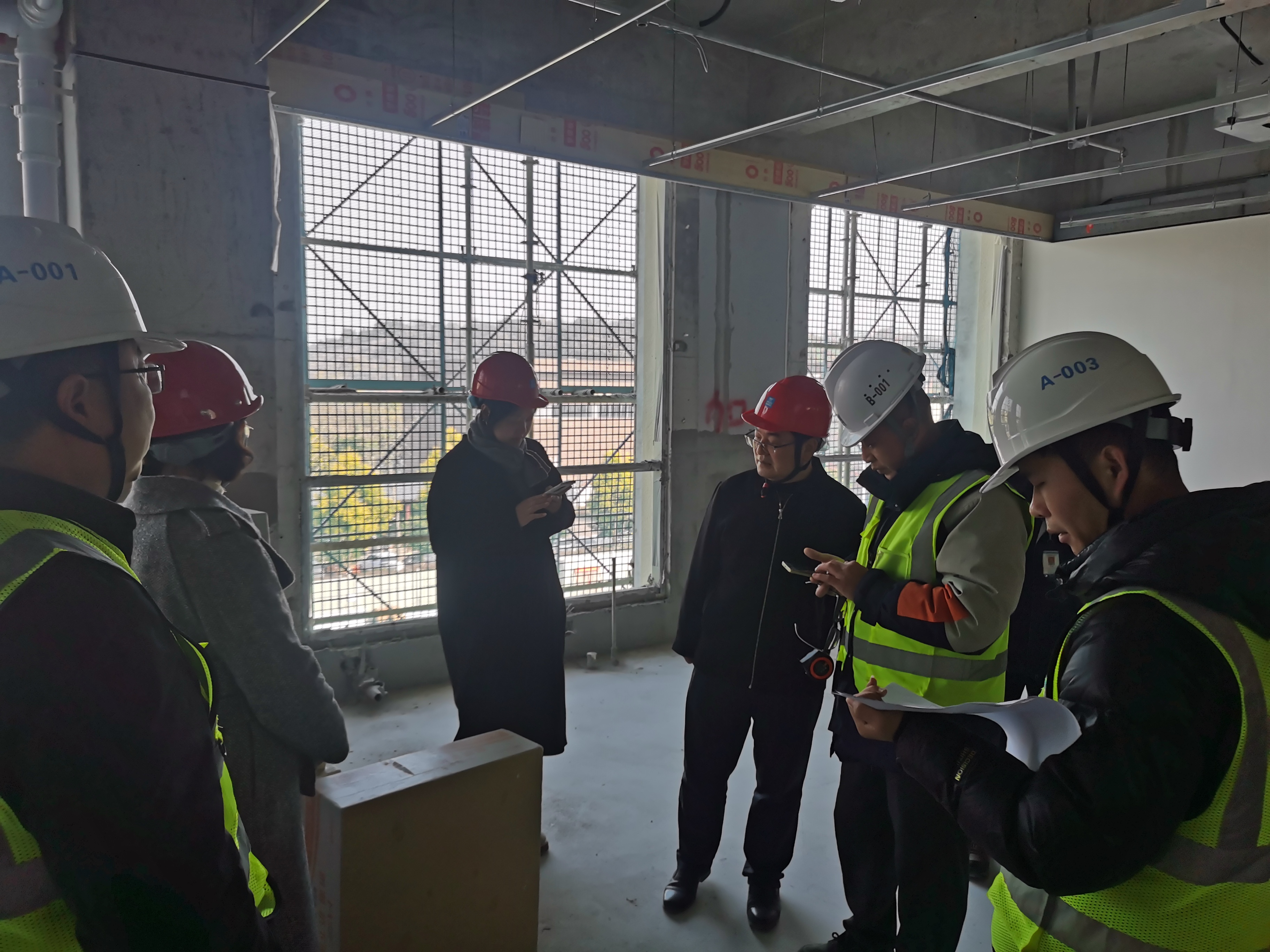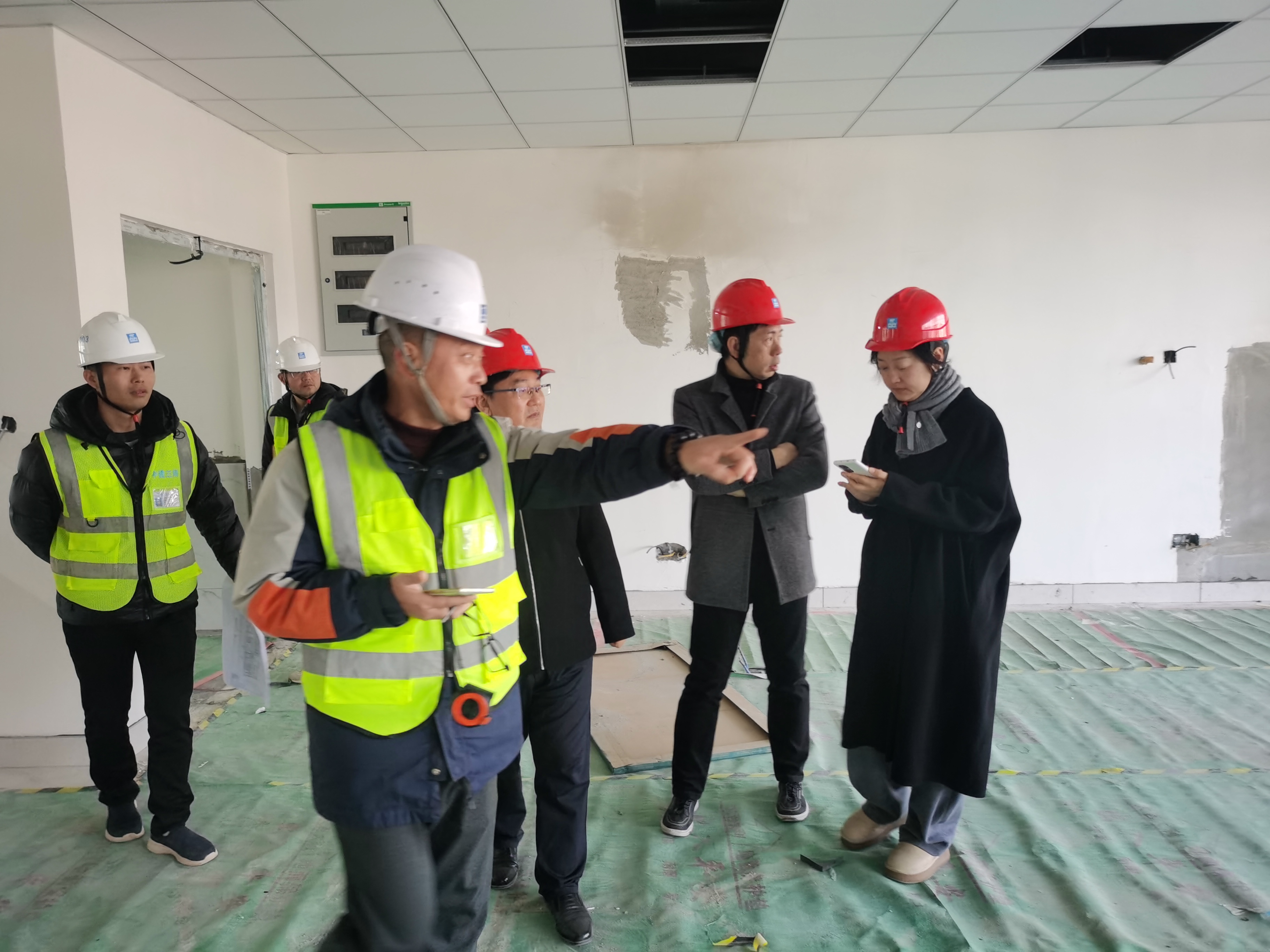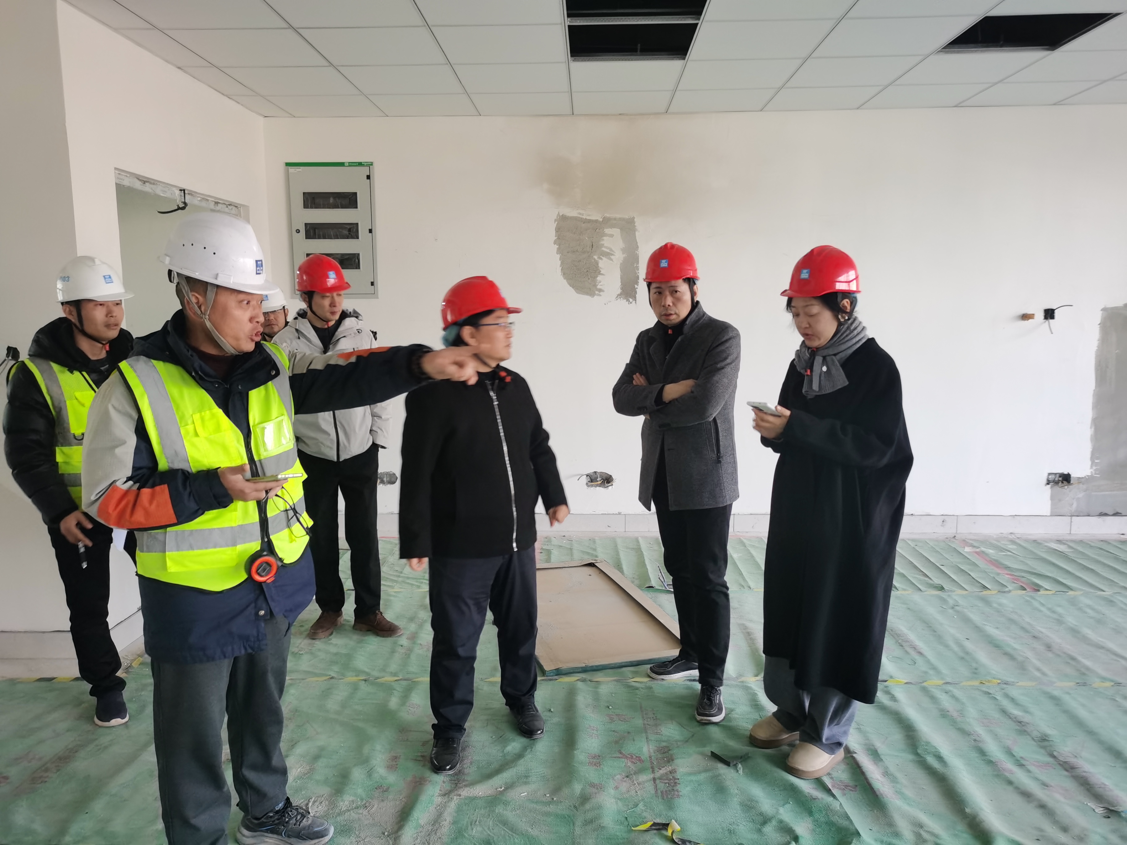 考察组一行深入项目建设现场,详细查看了实训室的空间布局、功能分区、施工进度及设施配置情况。在考察过程中,彭浩处长就项目整体规划、建设进展及当前面临的挑战进行了现场汇报。张维维主任重点介绍了各实训室的功能定位、设备规划及未来在教学、科研、社会服务方面的应用前景。