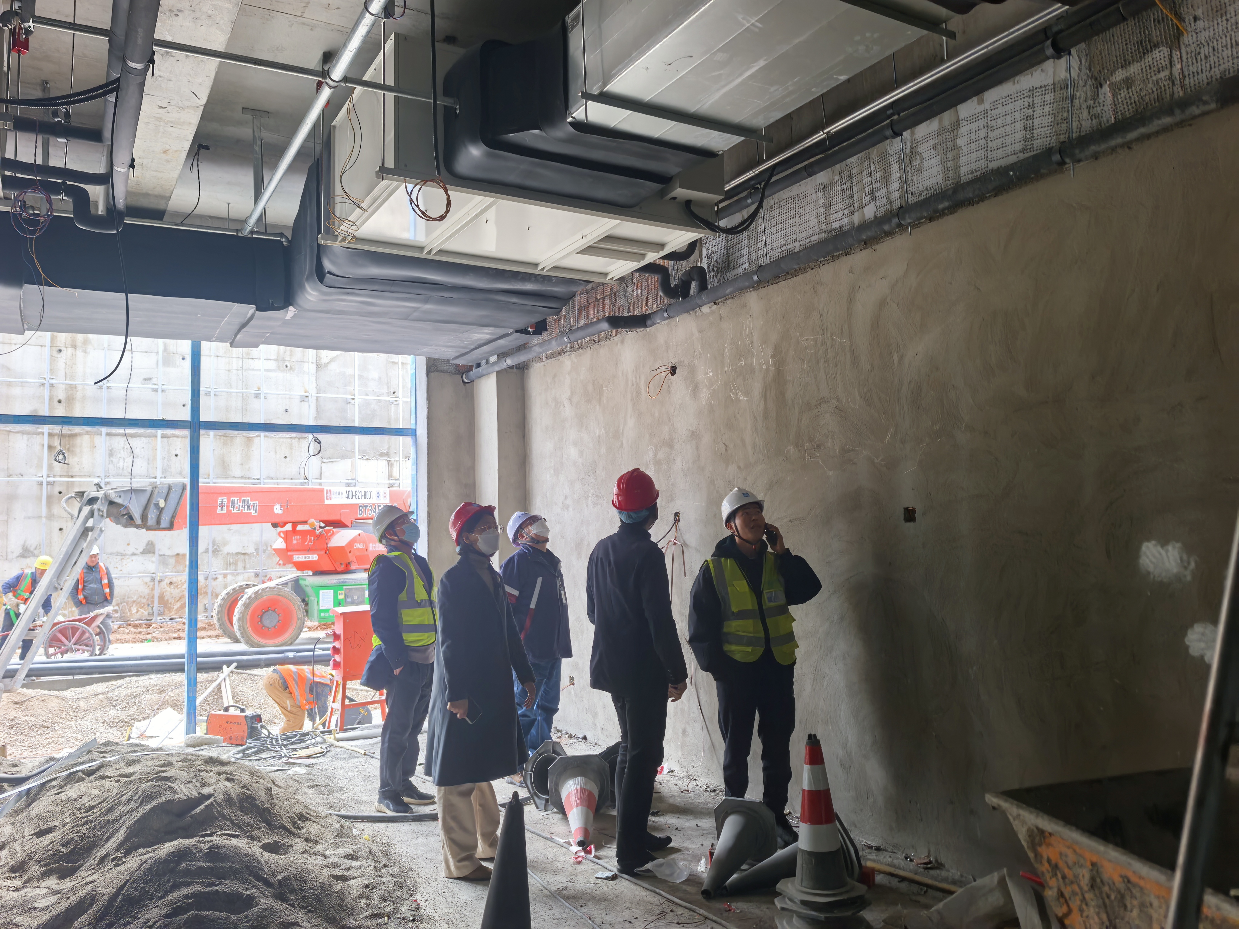 12月23日下午,康养项目监理例会结束后,肖玲副校长带领基建处、监理及施工单位负责人,立即前往施工现场,针对例会上提出的电梯厅色带与灯带施工、地下室配电室吊顶方案等施工难点进行现场拍板。