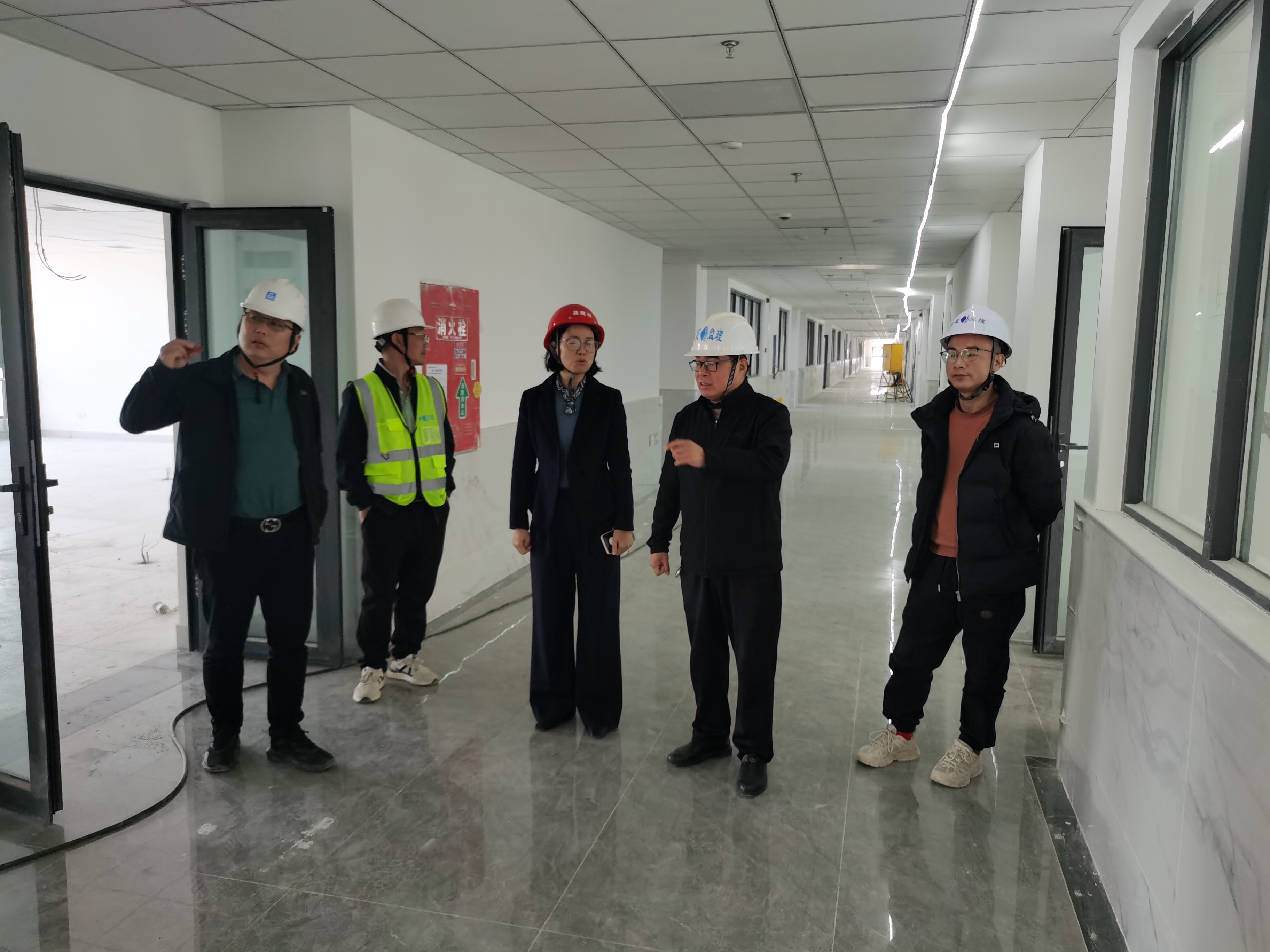 在施工现场,肖玲副校长一行仔细察看了各楼层的施工进展、室内外装修及配套设施安装情况,详细询问了工程收尾阶段的计划安排和质量控制措施。肖玲副校长对项目整体建设成效给予肯定,并对参建各方的辛勤付出表示感谢。
