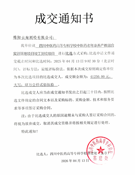 上一条:四川中医药高等专科学校中医药老年康养产教融合实训基地项目竣工消防设施检测项目成交通知书 下一条:四川中医药高等专科学校中医药老年康养产教融合实训基地项目竣工测绘项目比选公告