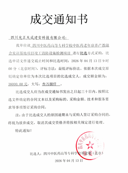 四川中医药高等专科学校中医药老年康养产教融合实训基地项目竣工消防设施检测项目成交通知书