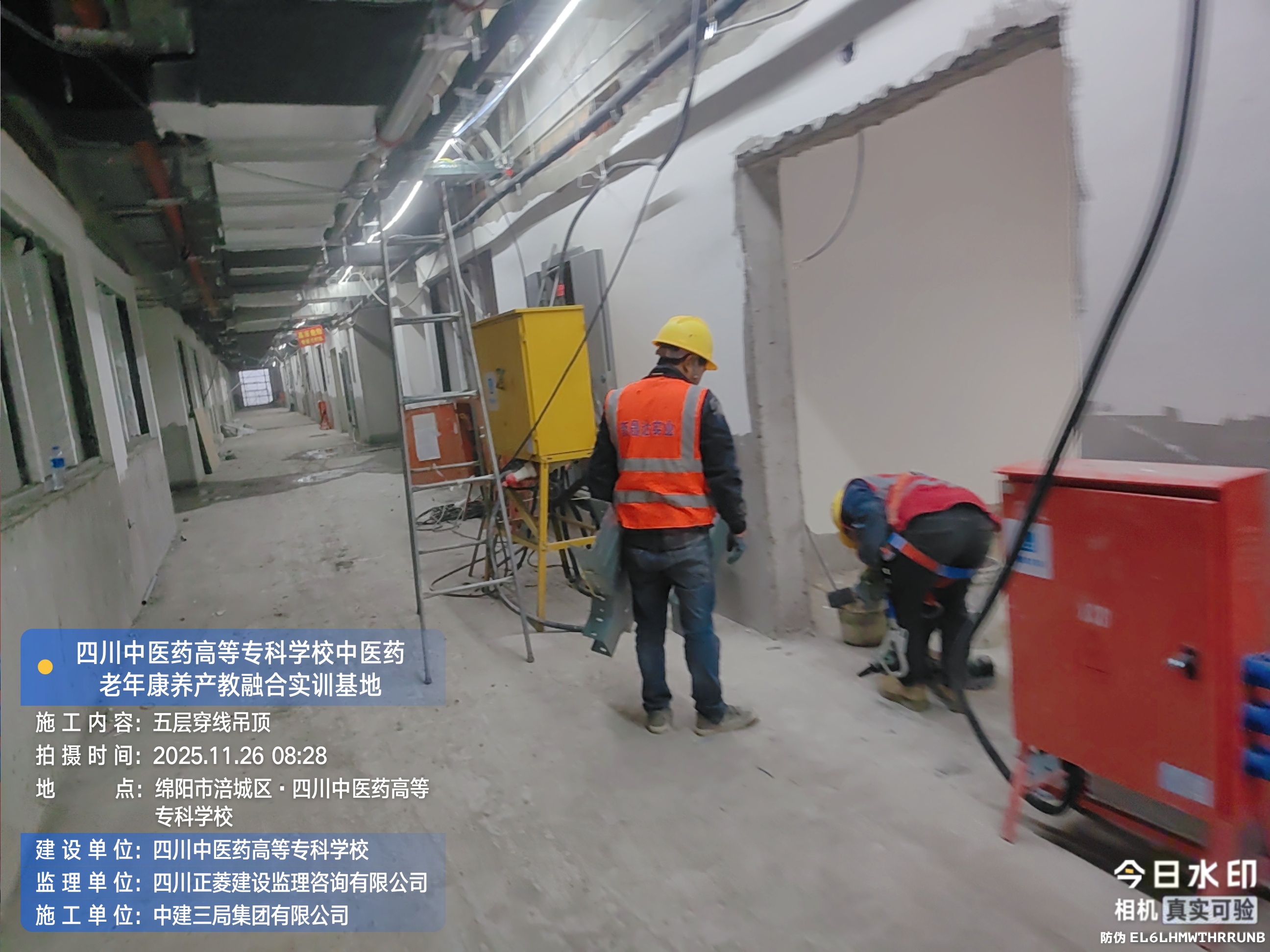 五层进行穿线、吊顶施工;