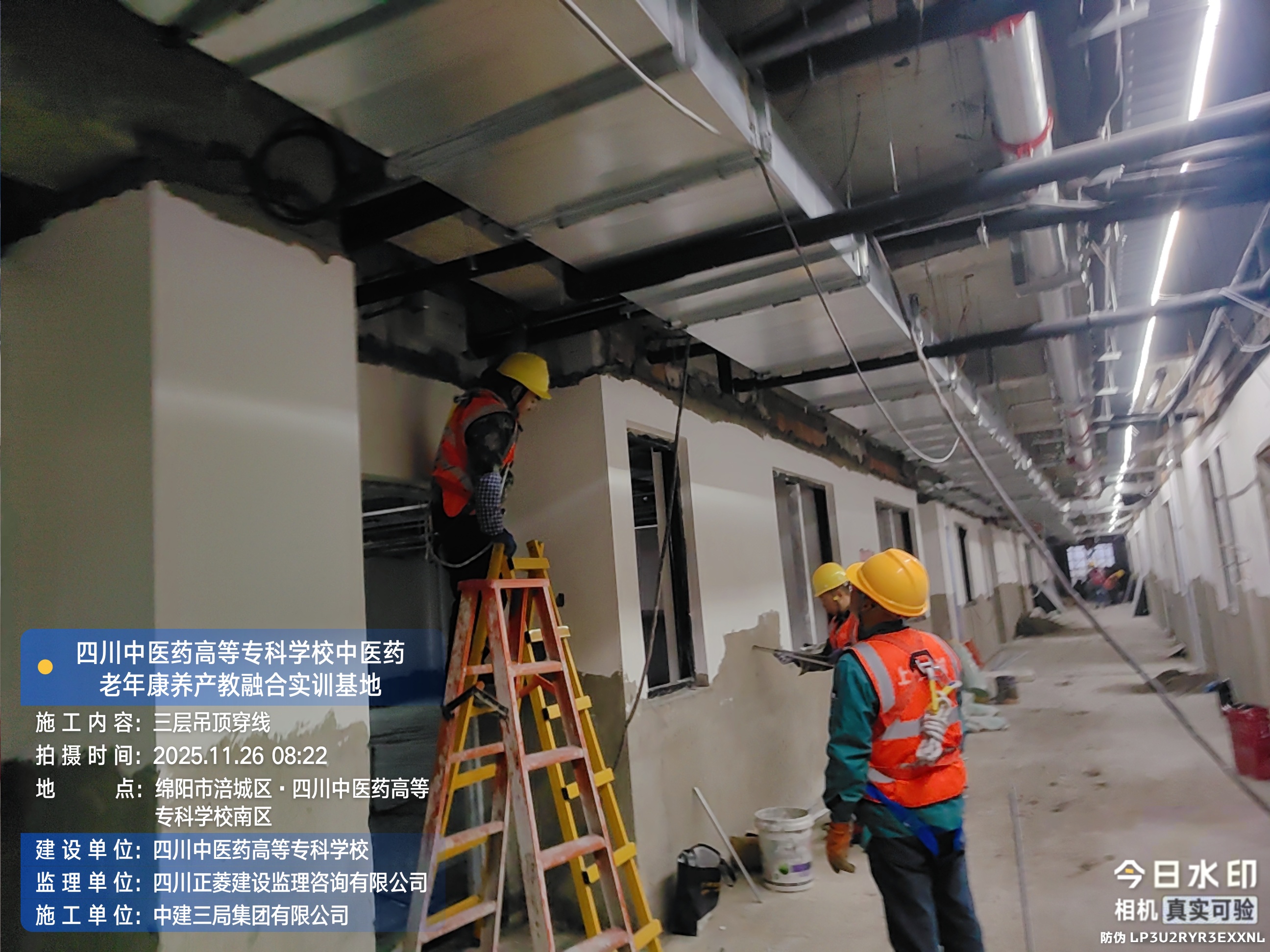 三层进行穿线、吊顶施工;