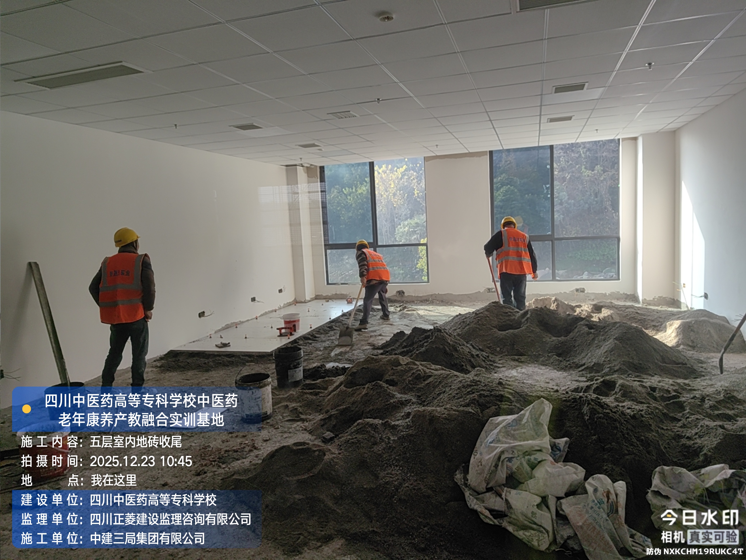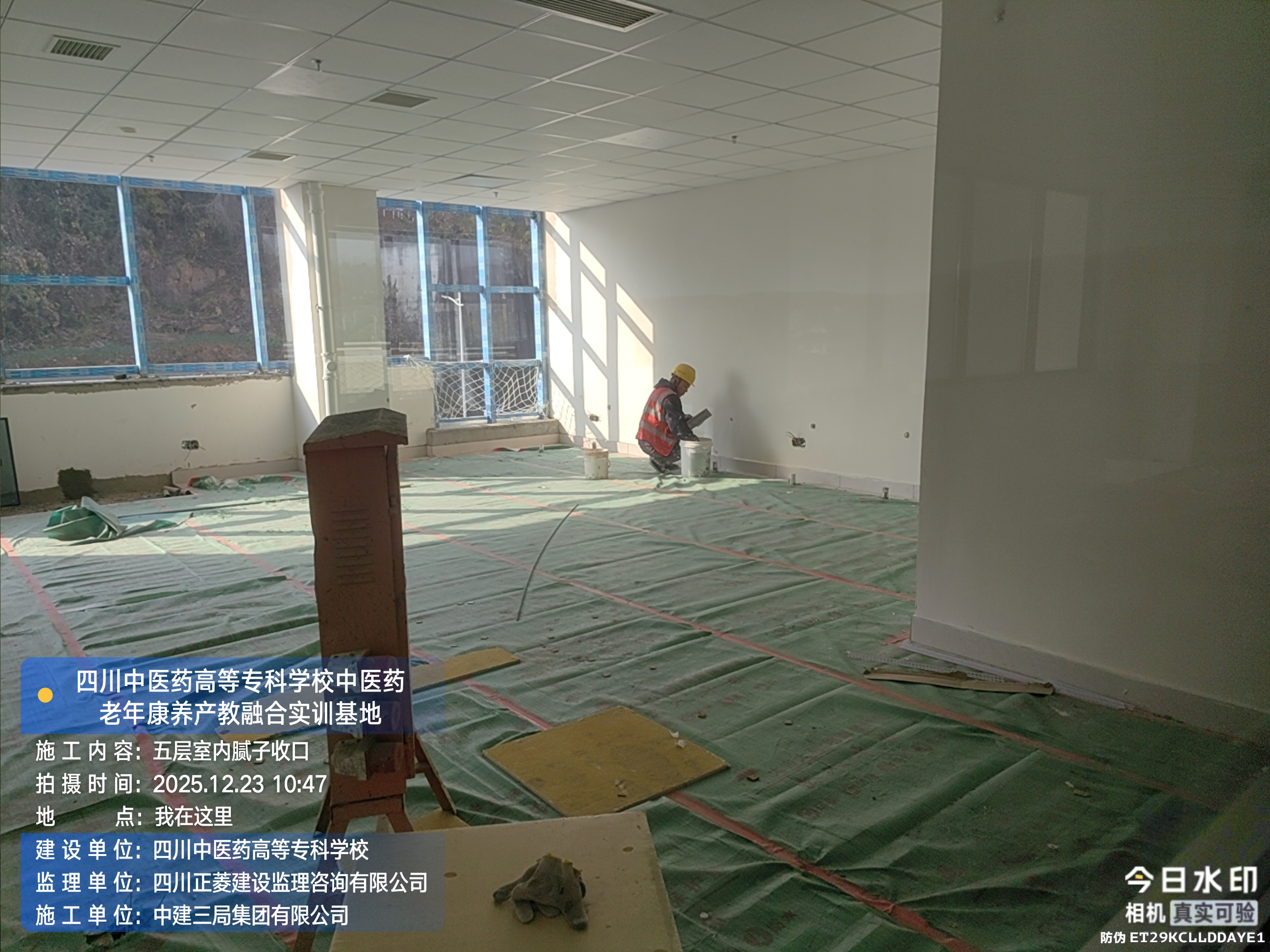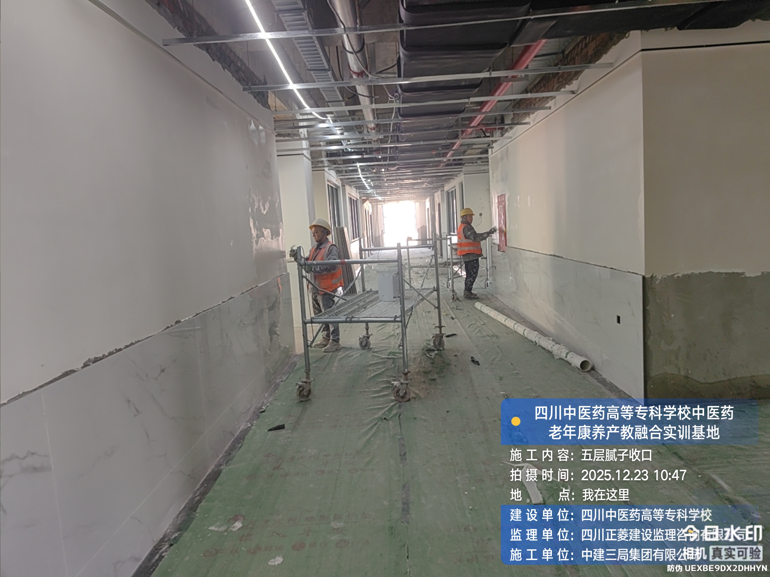 五层进行腻子收口、龙骨安装、地砖收尾施工