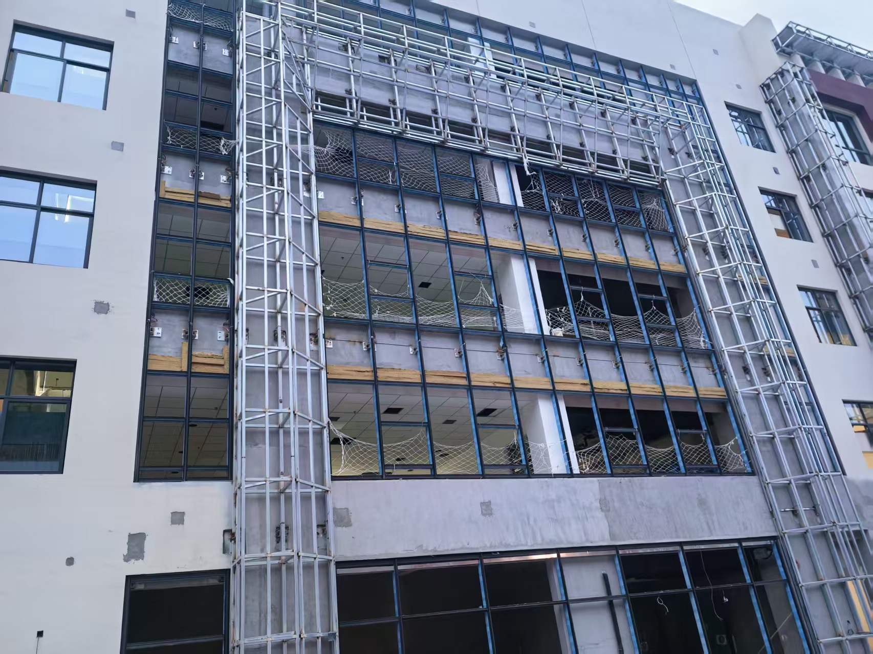 北侧外架拆除,挡墙龙骨焊接。