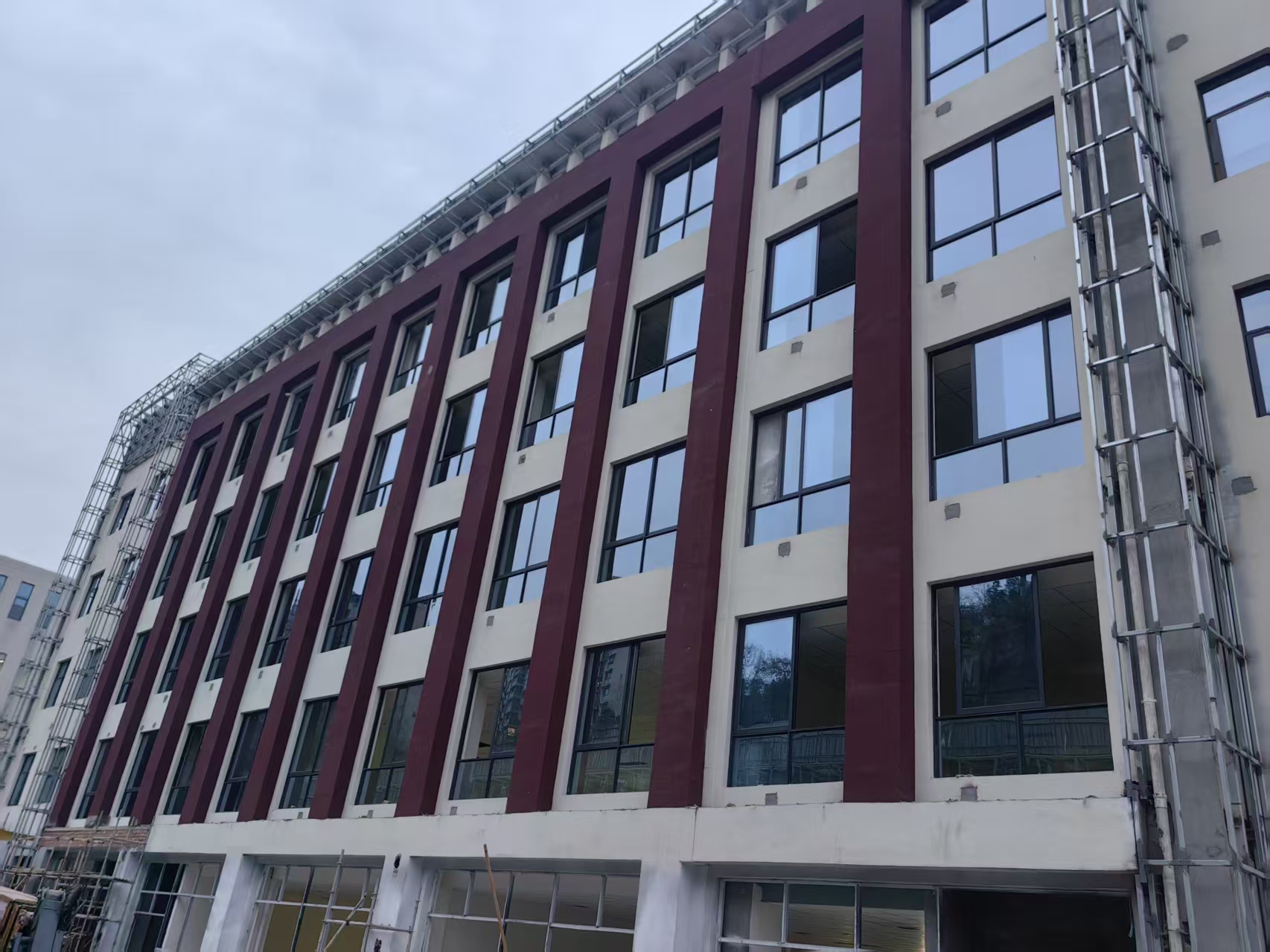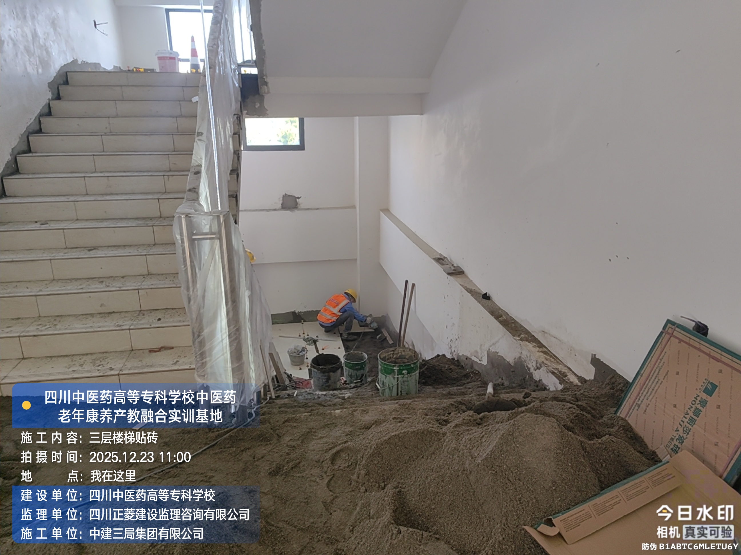 三层进行外窗玻璃安装、楼梯贴砖施工;