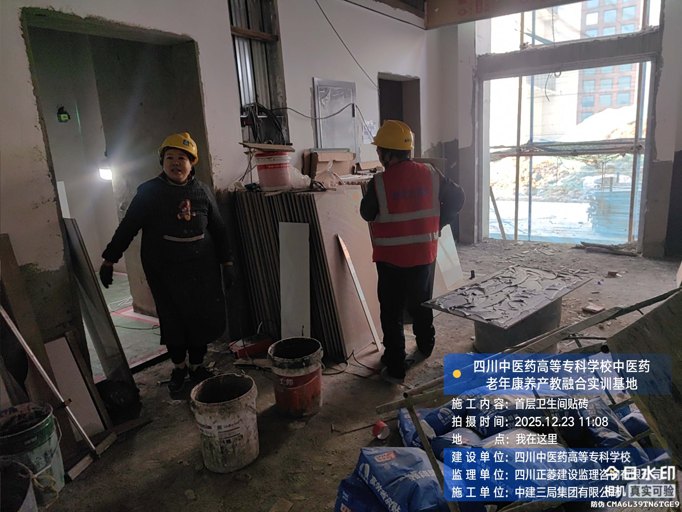 一层进行首层卫生间贴砖施工;