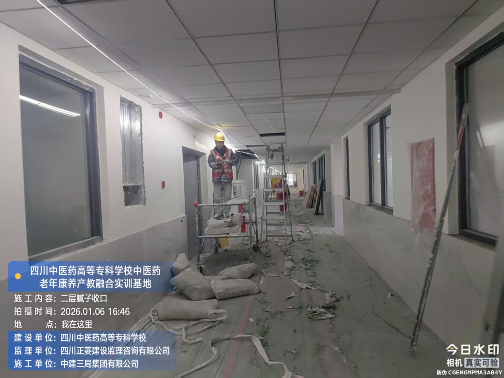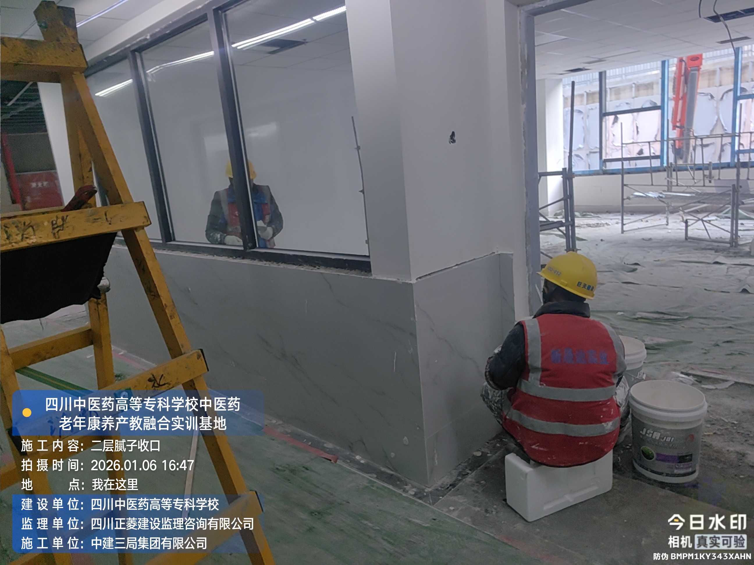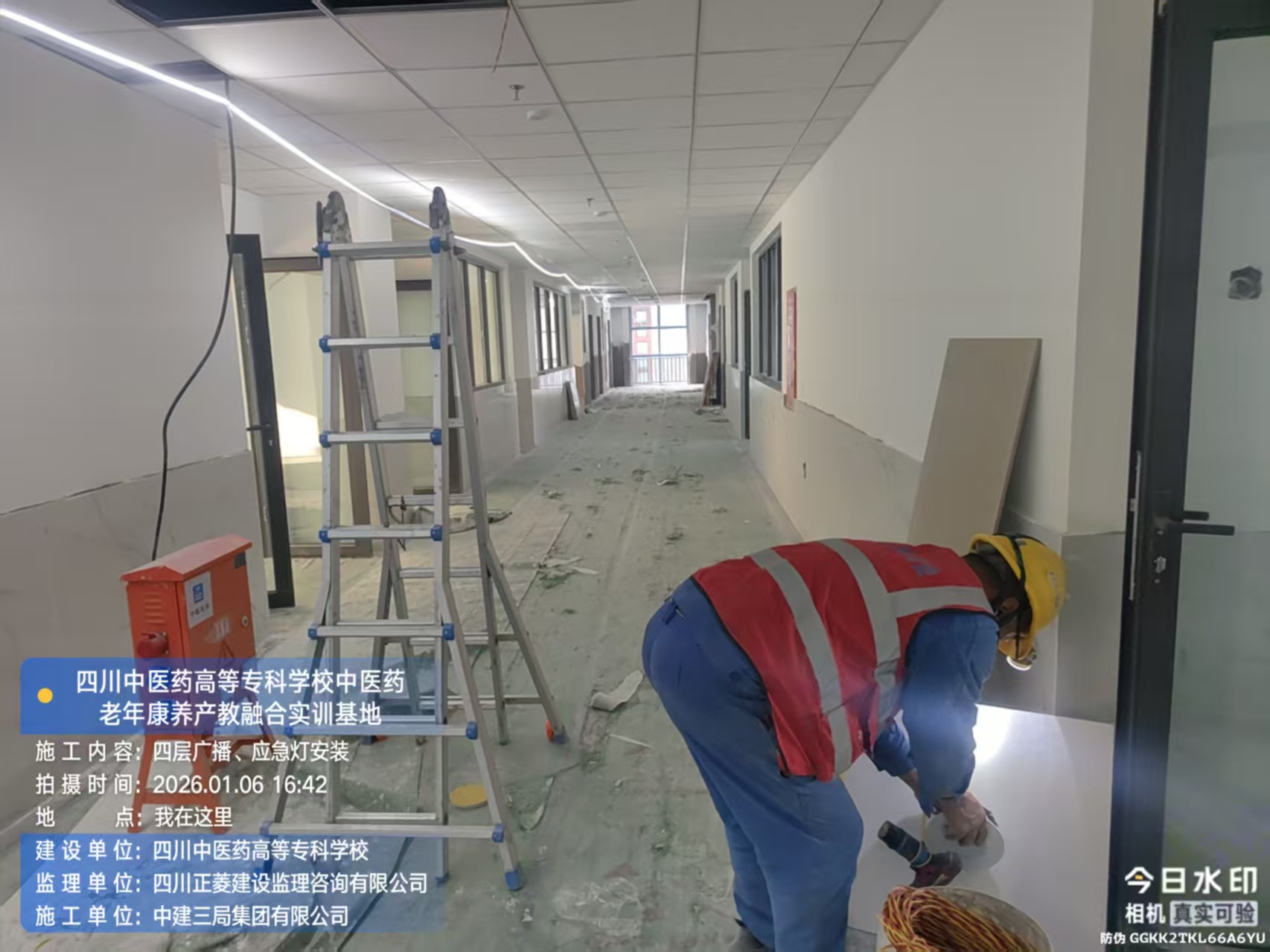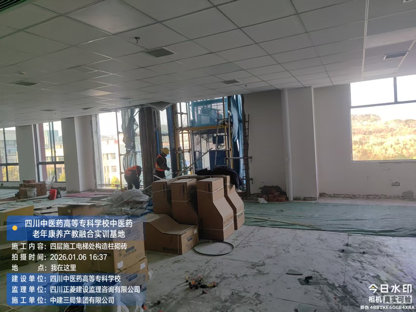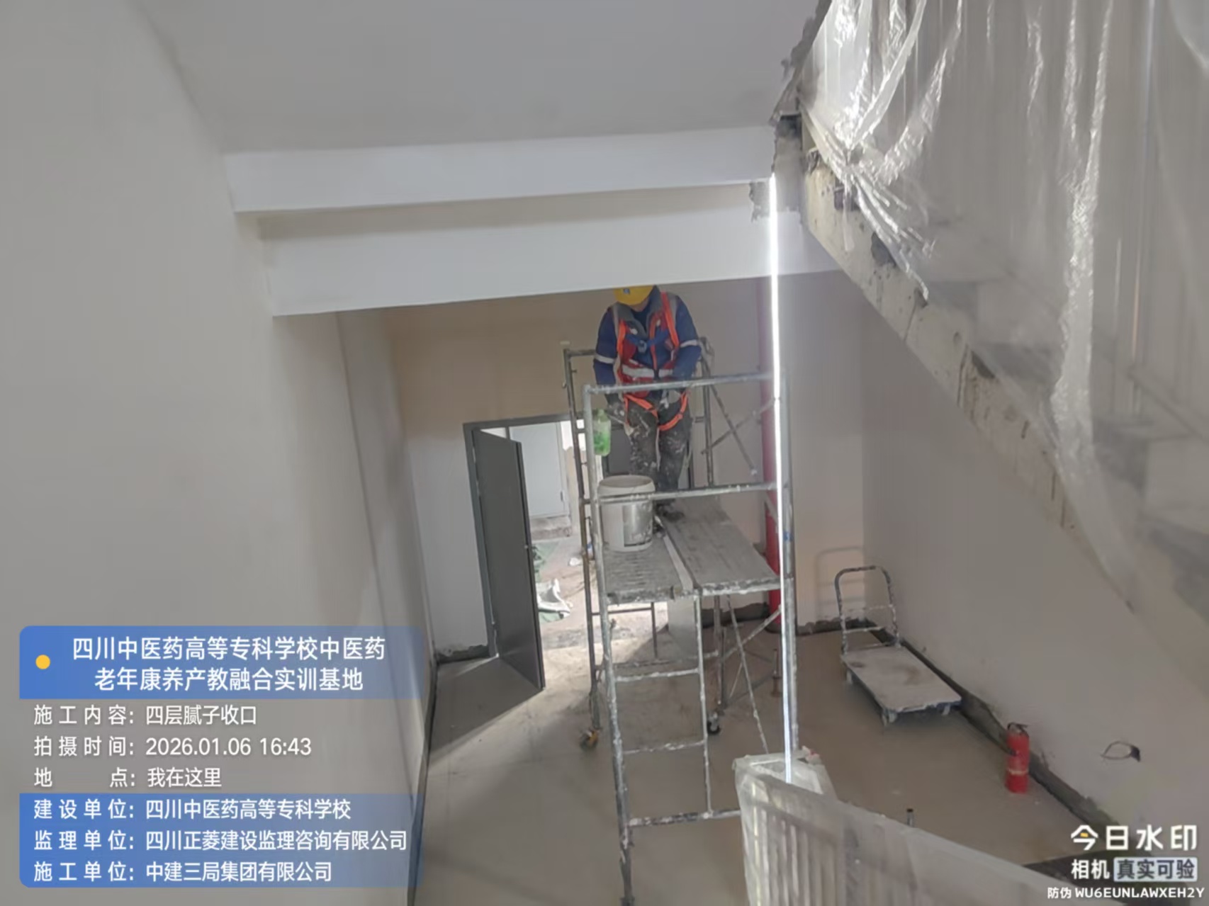 四层进行腻子收口、广播、应急灯安装、施工电梯处构造柱砌砖施工;